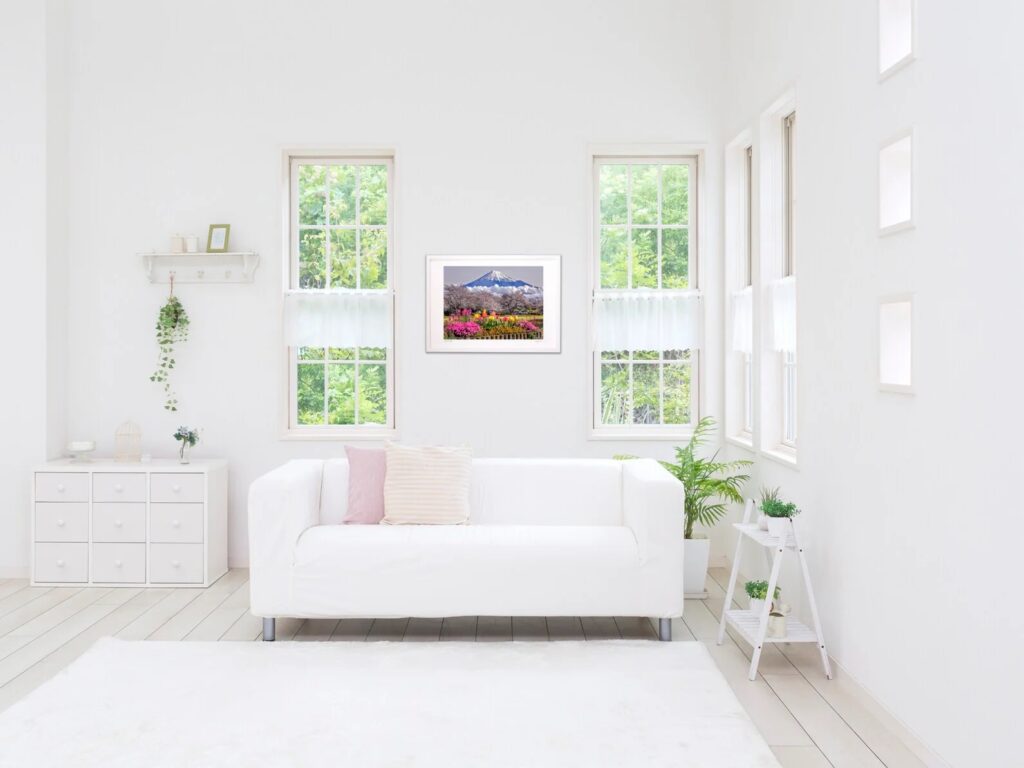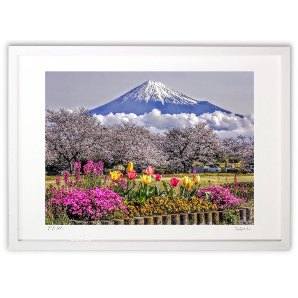 <春が待ち遠しい、やさしい景色をお部屋に。>春が待ち遠しい季節。やわらかな陽気の中、散歩道には花々が少しずつ色づき、まるで一枚の絵のように広がります。その景色を、そっと後ろから見守る富士山。何気ない春のひとコマが、心をふっと軽くしてくれる作品です。
