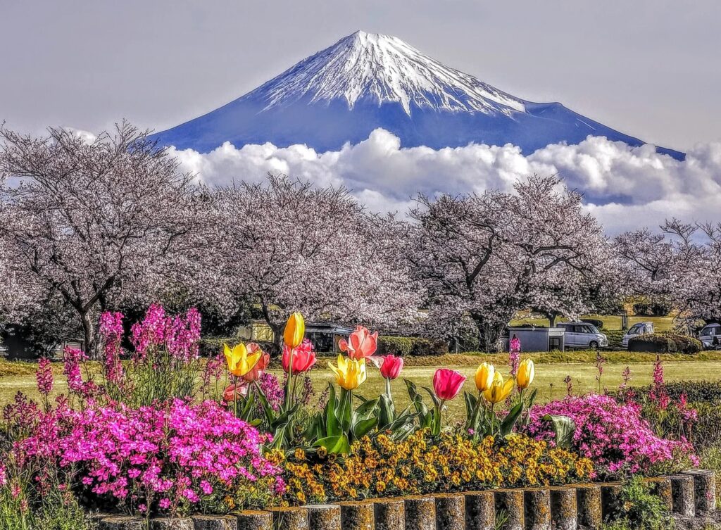 春の暖かな陽気な中散歩道の花々がまるで絵のようにカラフルに咲き始めてます。その後ろに富士山が優しく見守っていますね。