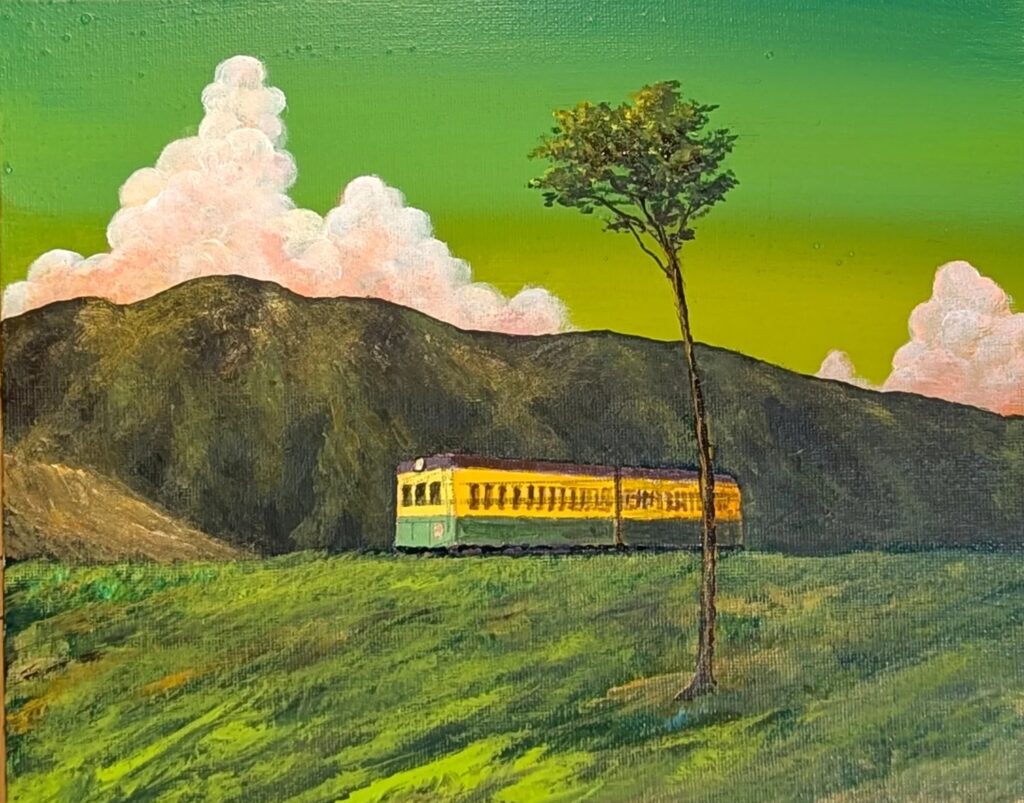 昭和の頃、淡路島には電車が走っていました。今は車が普及して廃線になっていますが、山や草むら、田んぼを見ながらの移動は楽しかったのではないでしょうか。その時の風景をノスタルジックに描きました。