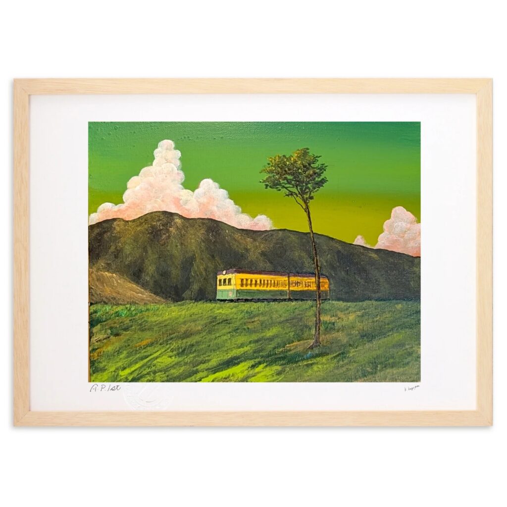 <のんびり走る、緑色の空。>どこか懐かしく、少し夢の中のような世界。広がるのは、現実と記憶のあいだにあるような緑色の空。人の手からなる絵画とは、こんなにも違う世界にヒュッと連れて行ってくれるのかと改めて感じます。肩の力を抜いて心を休ませてくれる一枚です。