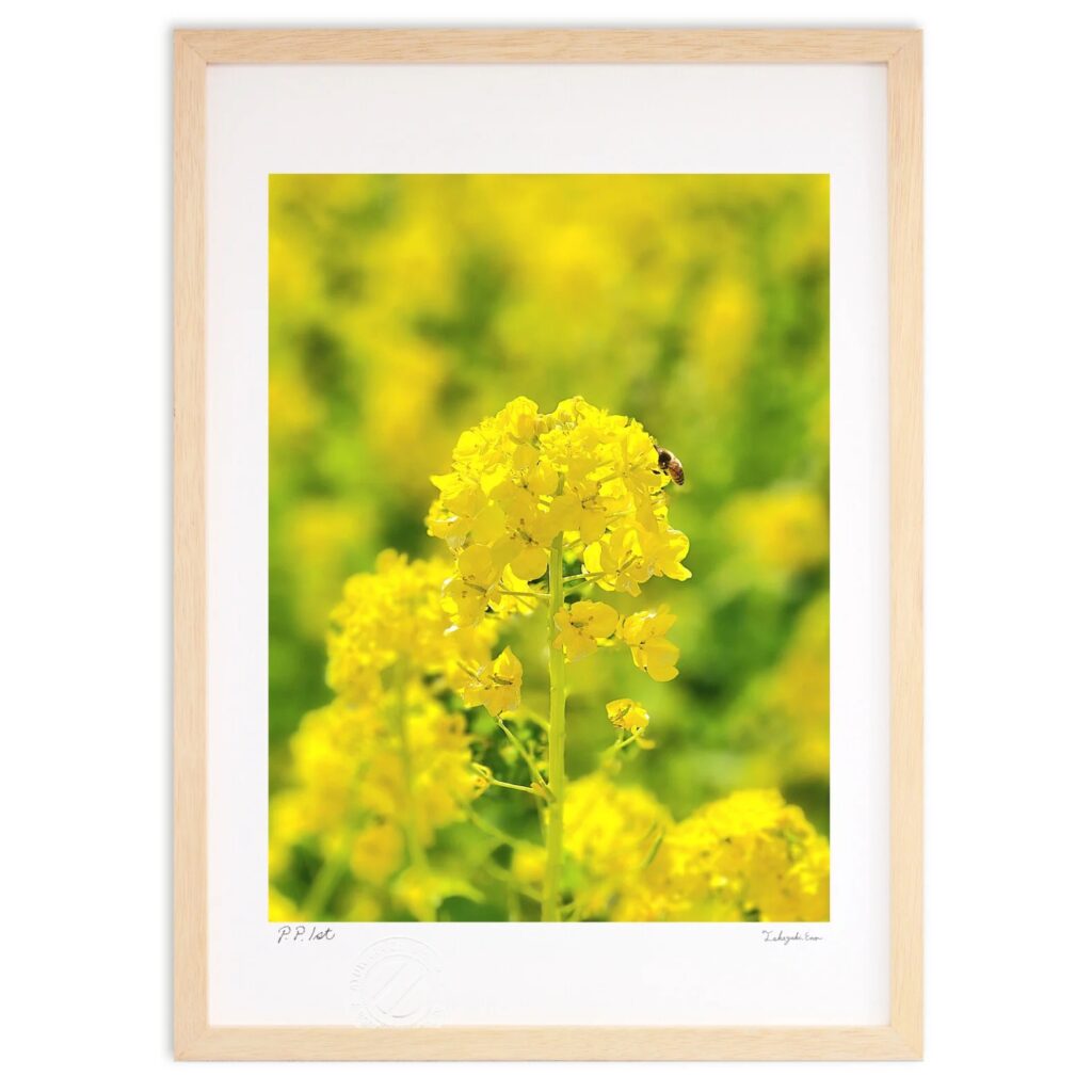 【風景投稿販売】<春、こんにちは>春を感じる、ビタミンカラーの菜の花。お仕事中のミツバチ。観ているだけで気分がパッと明るくなりますね。ナチュラルのフレームにとても似合っています。黄色は、左脳を刺激することから「ひらめき」効果があるとのこと。