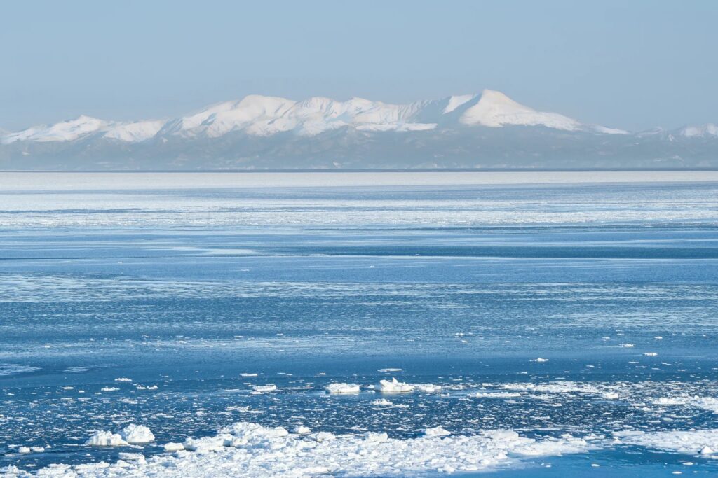 北海道網走市の海に漂う流氷です。流氷がやってくると冷やされた風で市街地も一段と寒くなるのです。