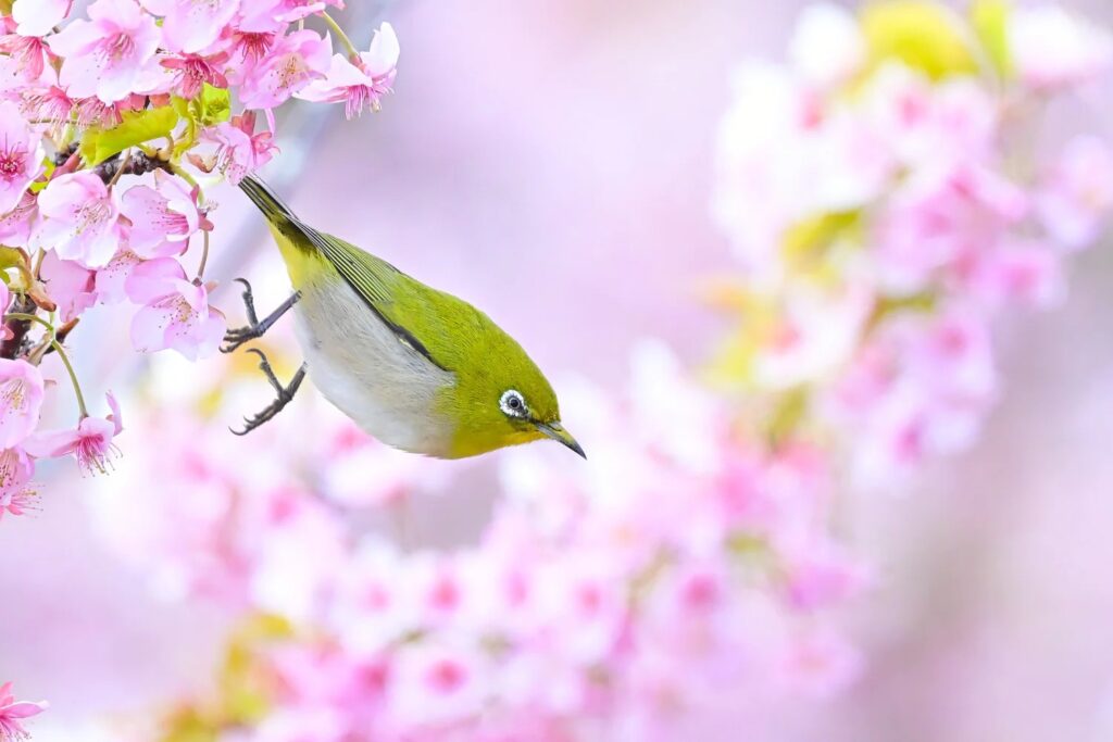 <満開のサクラに嬉しそうなメジロさんが飛び出した>