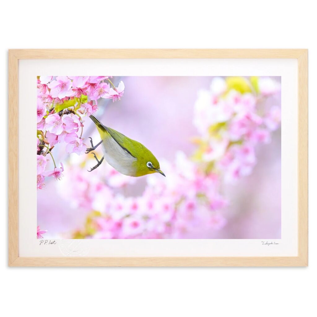 <春爛漫な桜色。>軽やかな色彩は、見ているだけで心まで明るい気持ちにしてくれます。メジロと葉っぱの色が似てるのがなんだか幸せ。お部屋に飾れば、そこに小さな春が訪れたような、あたたかくてやさしい空間が広がるはずです。