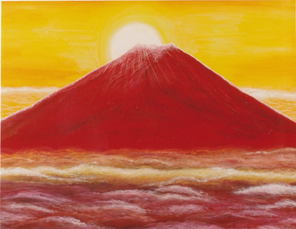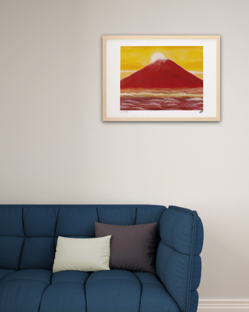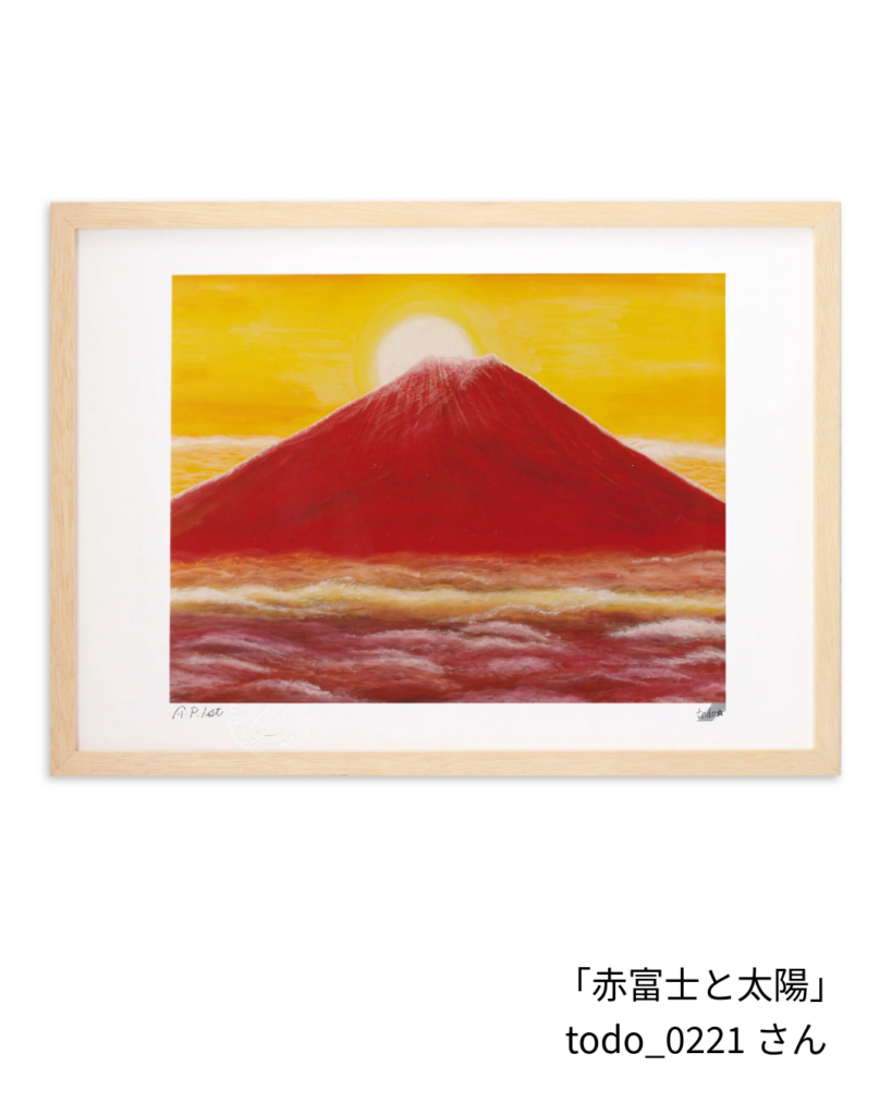 堂々たる姿に、太陽を戴き、雲海を従え、まさに在るという感じ。作家のtodo_0221さん曰く、「縁起物も好きで、富士山は描いて来ましたが、赤富士は当時は初めて描いてみたもの」とのことです。「初めて」だけに宿る力がある気がします。力強い作品を飾って、元気になりましょう!