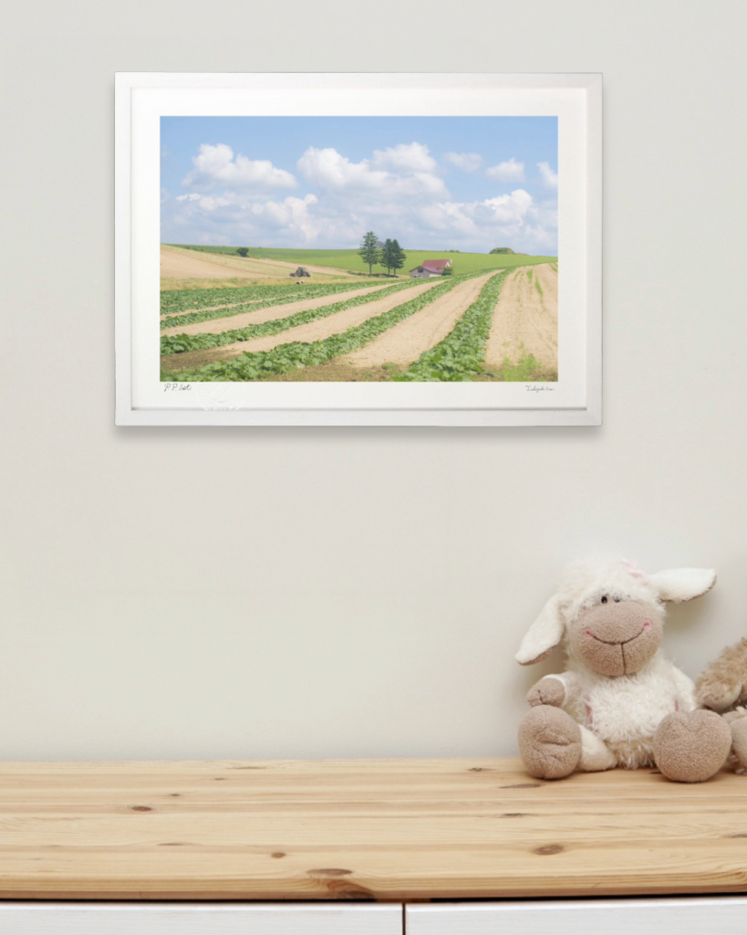 そろそろ夏のことも考えないと…と探してみたら、色の優しい夏の景色。トラクターがあんなに小さい。人の営みはこれくらいでいいのではないかとも思います。どこまでも雄大な北海道がのどかに表現されている作品です。
